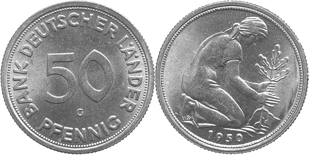 Foto 10 Fehlprägung 50-Pfennig Bank deutscher Länder 1950 G, Wikimedia Commons, Gemeinfrei, Autor Raphael
